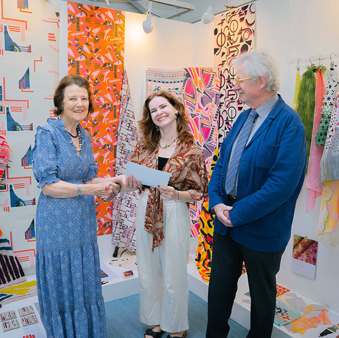 Hannah is seen here at the AUB Summer Show, flanked by Mary and Professor Sir Christopher Frayling, who presented our Prize. As well as being Chancellor of Arts University Bournemouth, Sir Christopher is also our Patron.