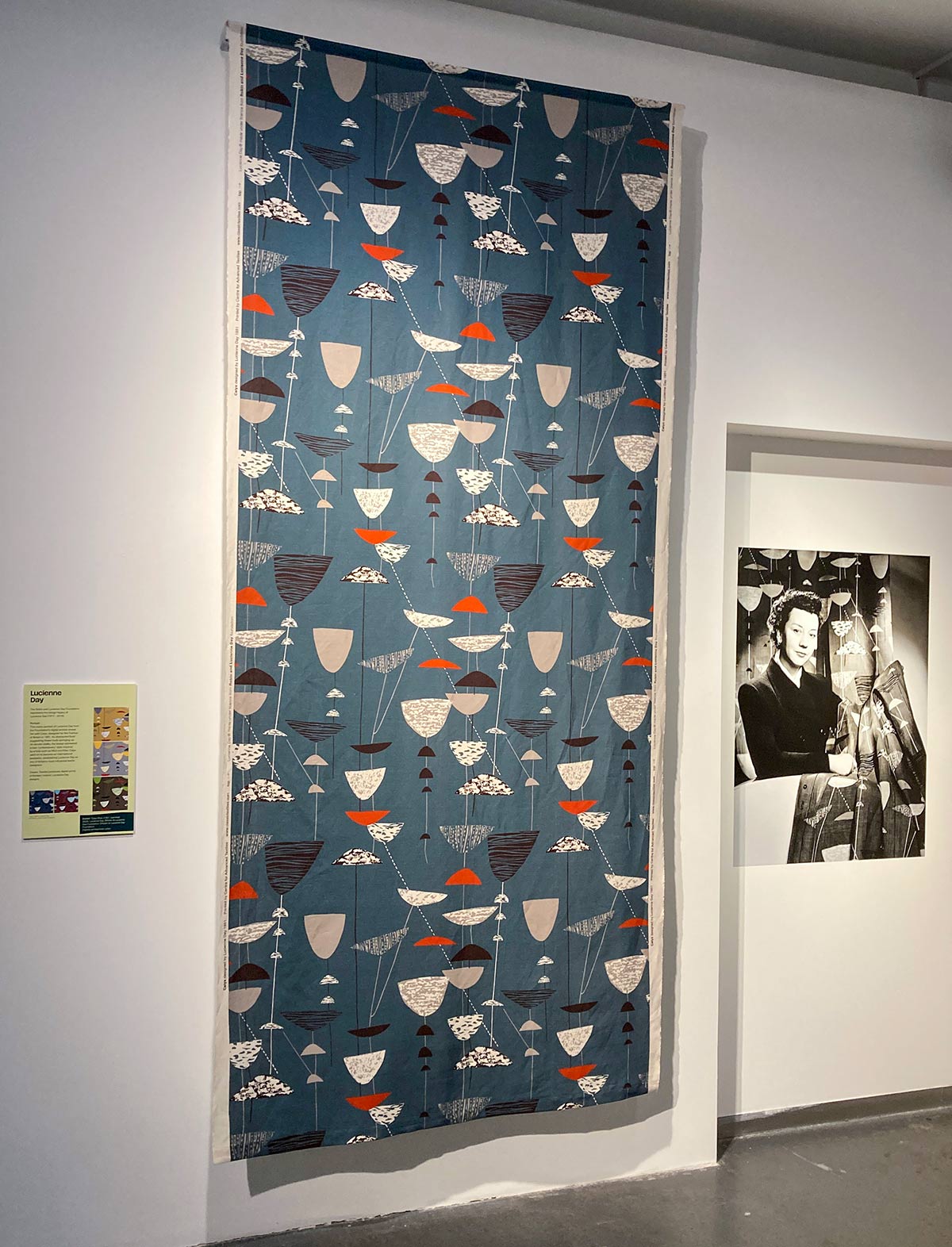 In 2003 Lucienne personally collaborated with Classic Textiles at CAT on digital reprints of twelve of her historic designs, including her most famous textile Calyx, which she created for the 1951 Festival of Britain. The exhibition showcases our archive portrait of Lucienne with Calyx, alongside a length of Classic Textiles’ reissue of the design.